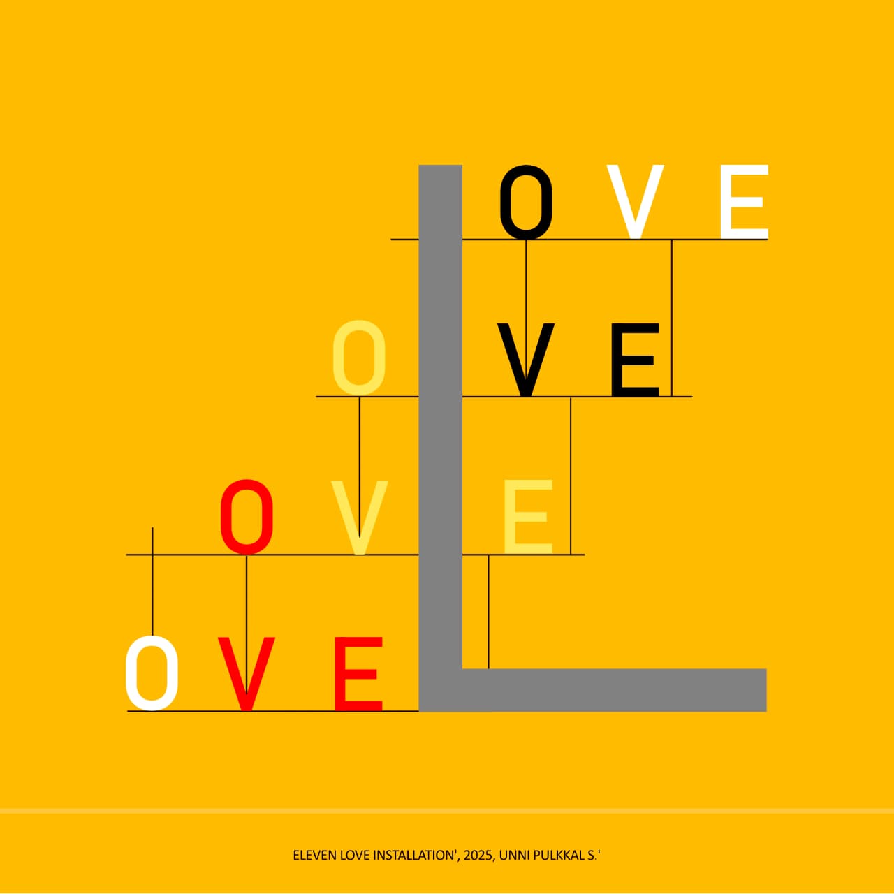 Conceptually, the work draws inspiration from Robert Indiana’s iconic 1970 LOVE sculpture, which transformed a simple four-letter word into a global cultural emblem. Yet while Indiana’s work focused on the power of the word itself, Pulikkal’s Eleven Love expands the idea into a more complex exploration. By making the word LOVE legible in multiple forms, he underscores its shifting, plural nature: love is never just one thing, never bound to a single definition. It is personal and universal, visible and hidden, singular and infinite.